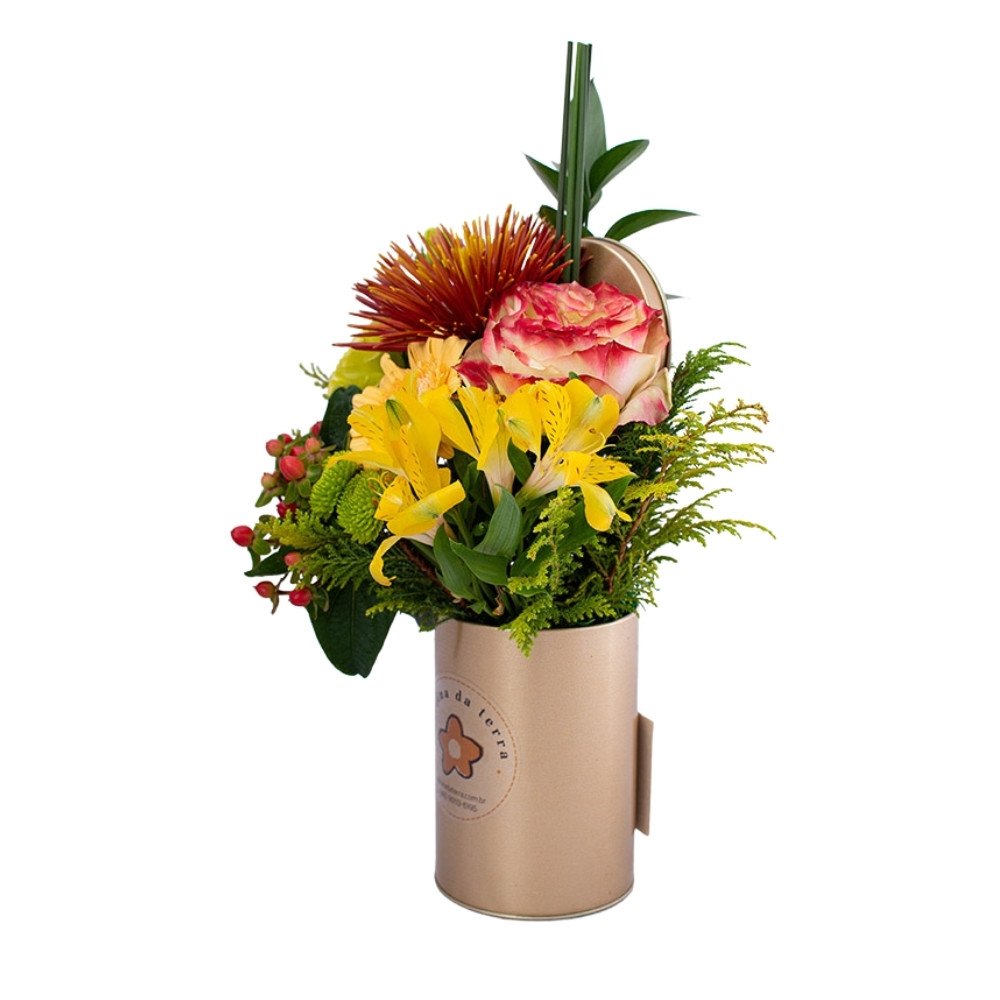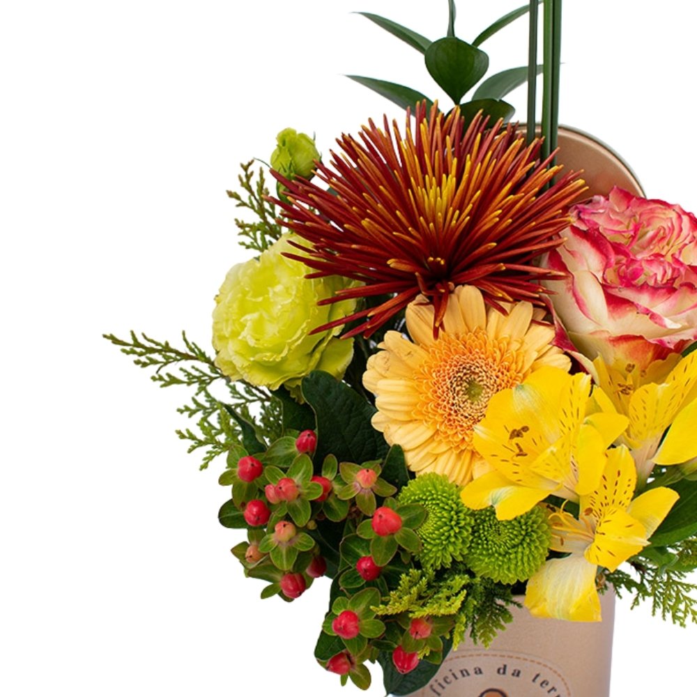 As diferentes flores e folhagens se complementam em texturas e formas, criando um arranjo moderno e equilibrado que leva frescor e movimento ao ambiente. Cada detalhe valoriza a força das cores naturais, transformando o arranjo em um presente cheio de significado e boas emoções.