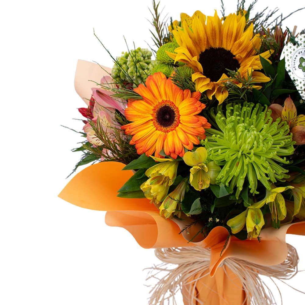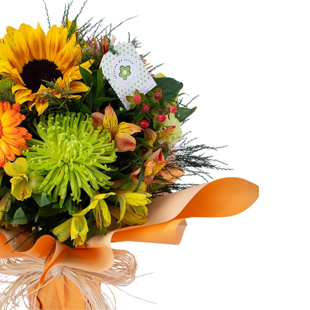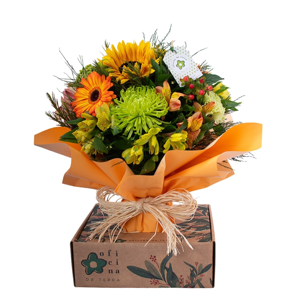 Produzido artesanalmente, o arranjo reúne flores como girassol, gerberas, crisântemos e astromélias, acompanhadas por folhagens naturais e finalizado com elegante embalagem em papel decorativo laranja e laço rústico. Ideal para presentear em aniversários, comemorações, agradecimentos ou para levar mais cor ao dia a dia.